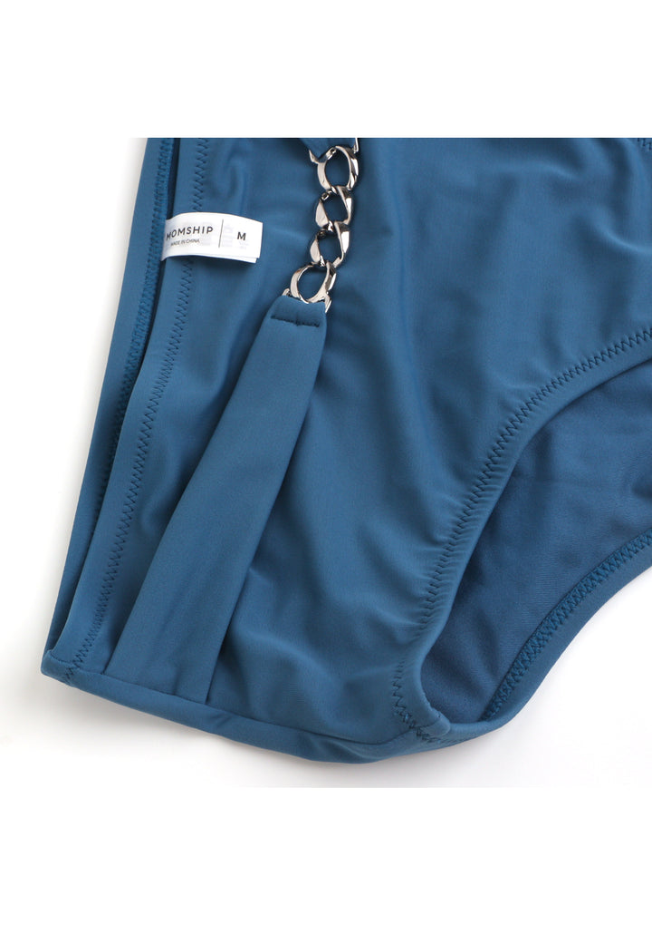 • High-waisted cheeky swim brief, silver-colored metal waist belt.