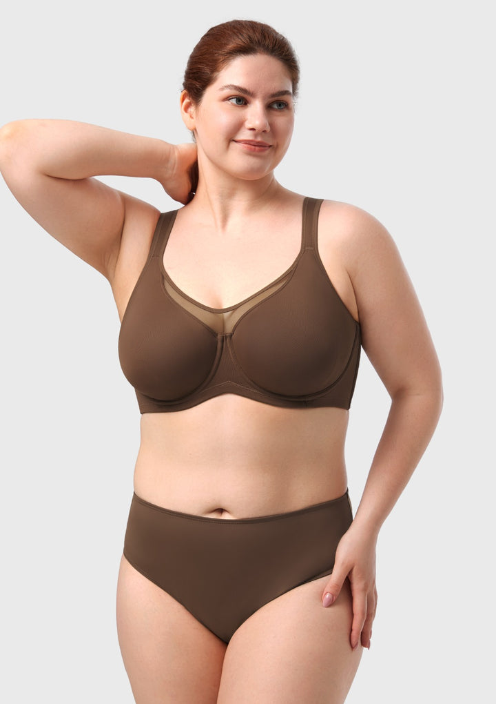 Dual-layer cooling fabric gently reduces appearance by 1-1.5 cup sizes. A chic mesh panel at the center front adds subtle allure while locking breasts in place—no spillage, just smooth curves.