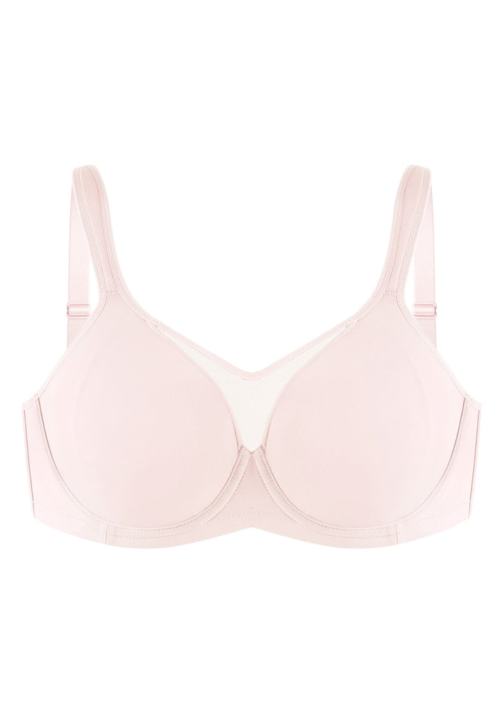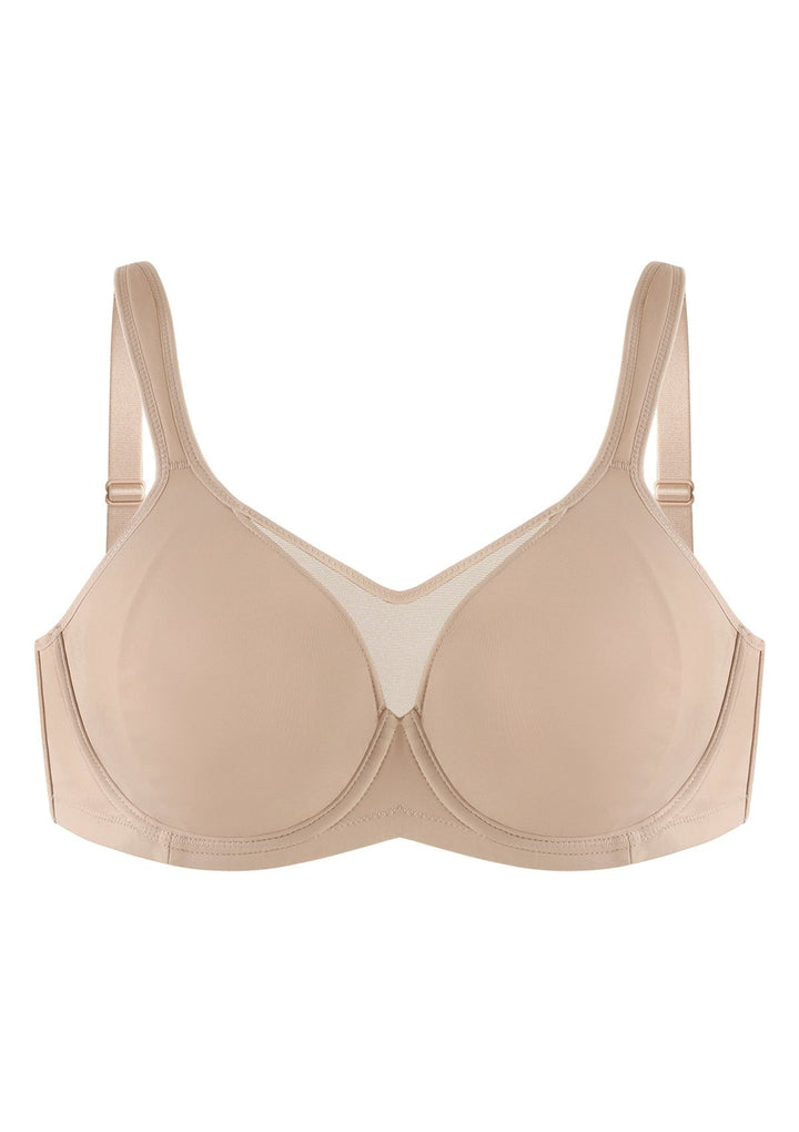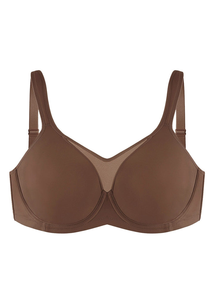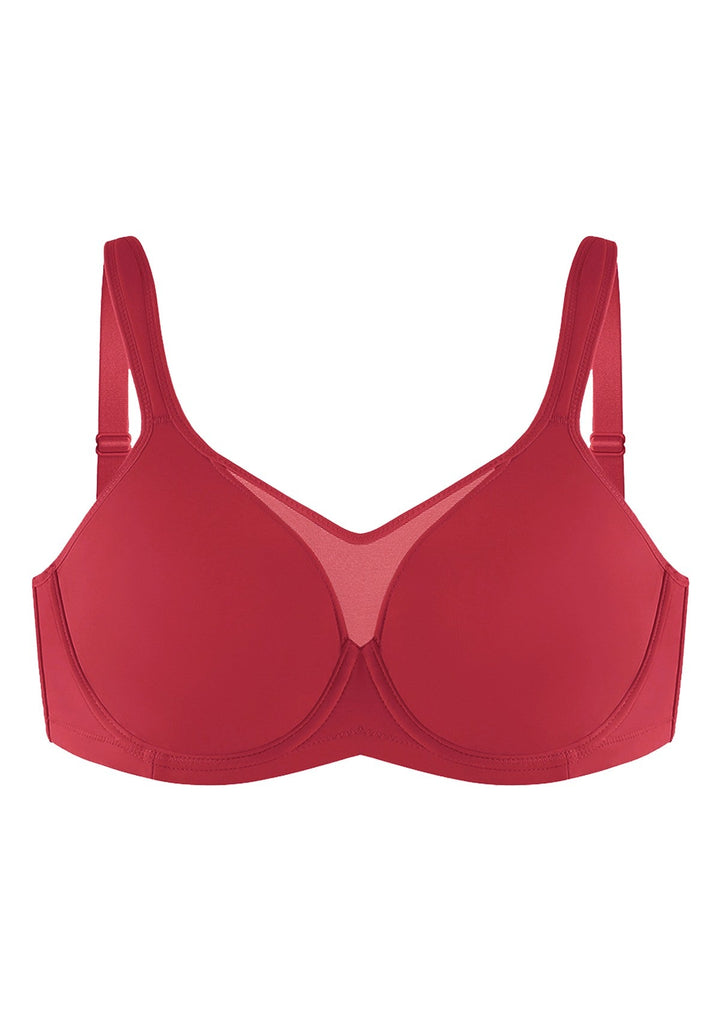 Dual-layer cooling fabric gently reduces appearance by 1-1.5 cup sizes. A chic mesh panel at the center front adds subtle allure while locking breasts in place—no spillage, just smooth curves.