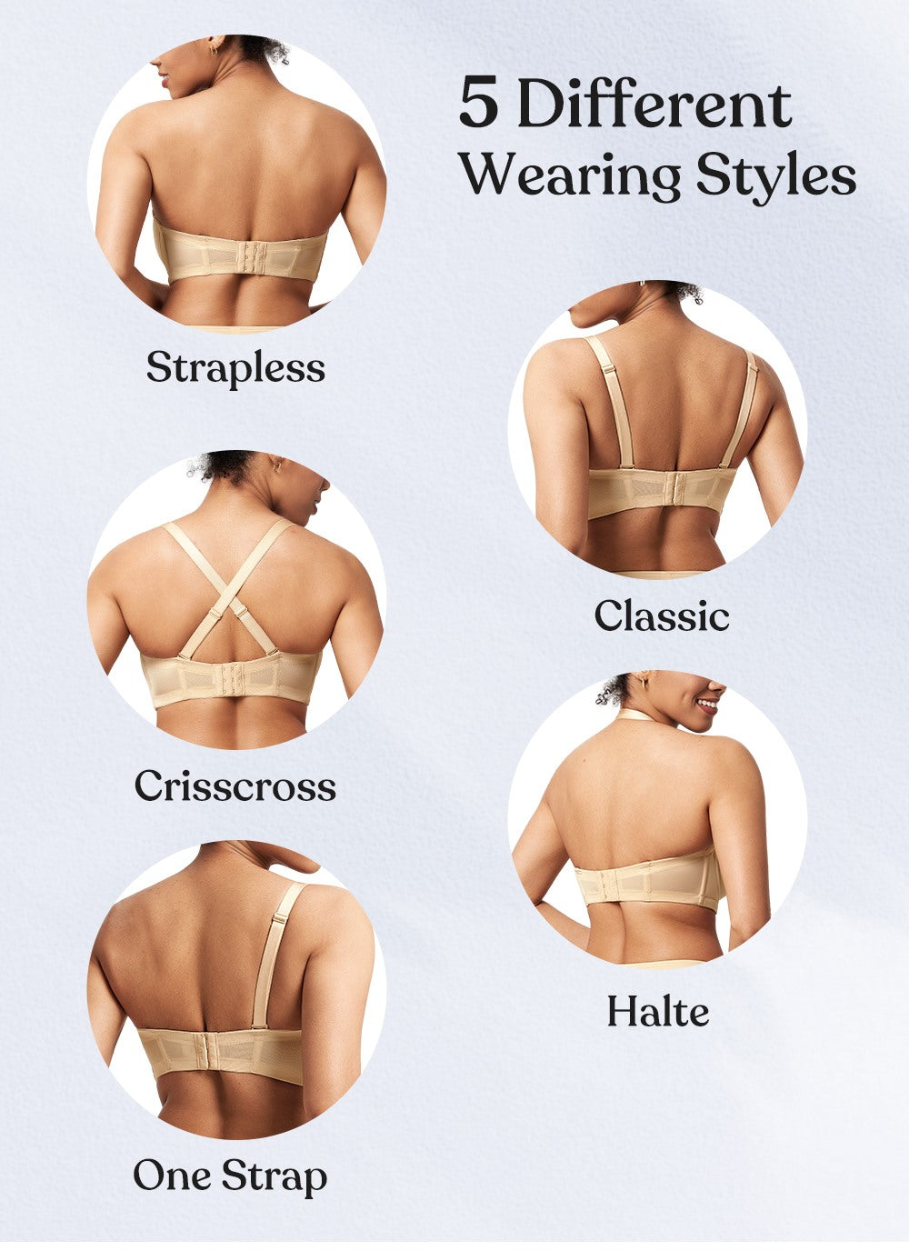 We stand behind our products. If you don’t love it, exchanges and returns are FREE for 30 days.Experience effortless style and comfort with our strapless bra, the ultimate foundation for your favorite sexy dress or top. This versatile bra features a simple and clean design. Optional straps allow you to wear the bra in classic, halter, cross back, or one-strap styles. Designed for maximum hold and comfort, the side panels are made of breathable power mesh, and silicone strips ensure that the bra stays in place all day.