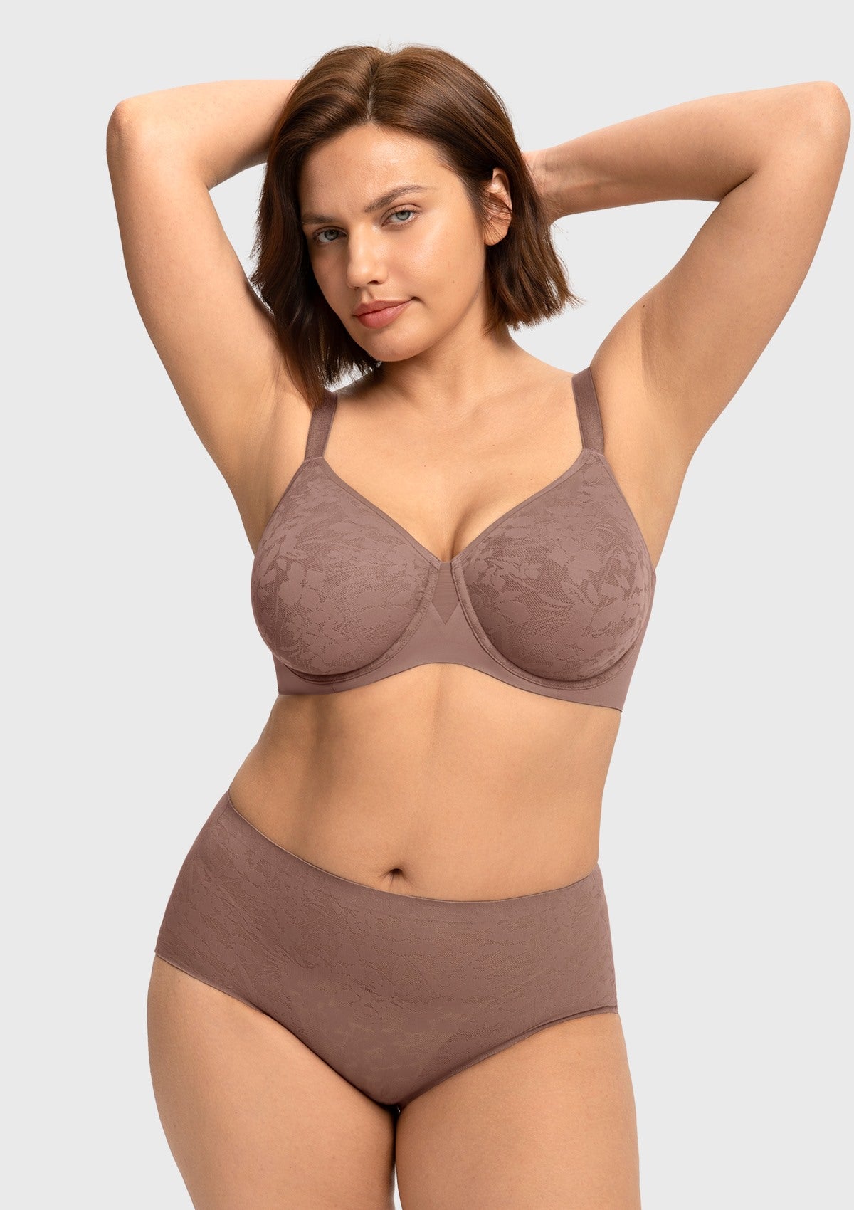 Full coverage lace cups are integrated with a supportive underwire and soft mesh. This combination delivers natural, reliable shaping and lasting comfort. Invisible Seamless FitFeaturing bonded edges and seamless construction for a completely smooth look under any clothing. The design eliminates lines and bulges for a perfect silhouette.