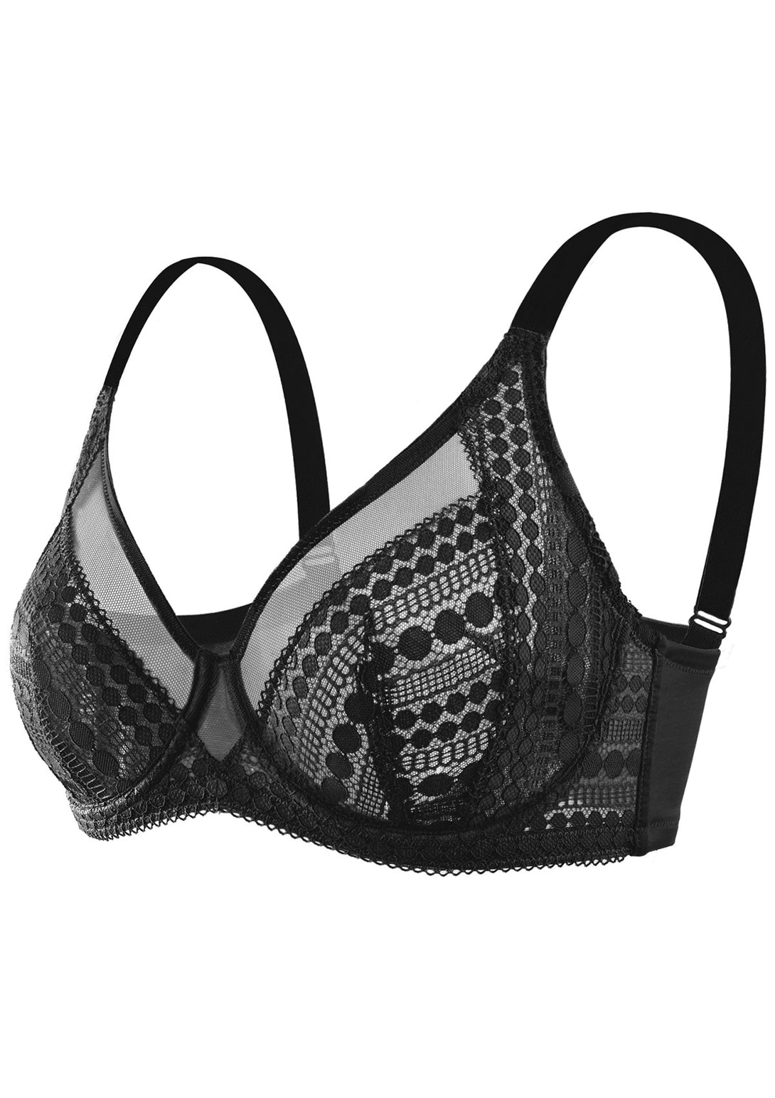 This unlined underwire bra is a wearable work of art, featuring sheer mesh along the cup tops and a polka dot patterned along the bottom and sides of the cups.